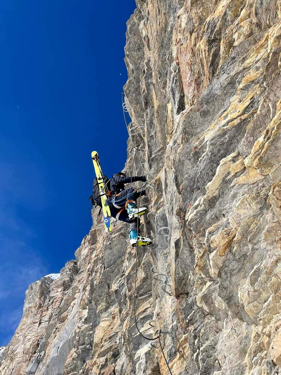 Auf vielen Skihochtouren endet es nicht mit einer breiten Gipfelkuppe. Man kraxelt die letzten Meter über einen Grat: Ski am Rucksack, Seil, Steigeisen an den Füssen. Genau das trainieren wir.
